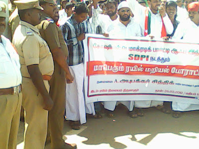 பின்னர் திருவாரூர், நாகை, தஞ்சை மற்றும் தெற்கு மாவட்டங்களிலிருந்து வந்திருந்த SDPI யினர் கண்டன கோஷங்கள் எழுப்பிவாறு திருவாரூர் ரயில்வே நிலையம் சென்றடைந்தனர். ஆனால் காவல் துறையினர் SDPI தொண்டர்களை ரயில்வே நிலையம் உள்ளே விடாதவாறு வெளியே தடுத்து அனைவரையும் கைது செய்தனர். பின்னர் மாலை 5 மணியளவில் கைது செய்யப்பட்ட அனைவரும் விடுதலை செய்யப்பட்டனர்.